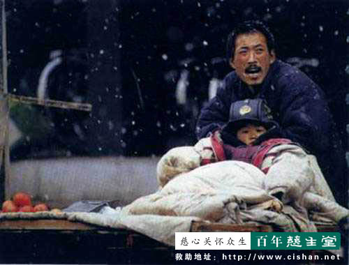一个中年男子的菜摊车上坐着一个小男孩,孩子用给菜保温的被子围着,父亲不时用手给儿子掖掖被子。作者说:“在阴暗的背景和漫天飞舞的雪花的衬托下,儿子稚嫩红润的小脸与父亲饱经沧桑的脸形成对比,父子俩面对生活的艰辛相依为命,特别是父亲使劲发出叫卖声时,脸部表情感人力度之大,使人看后心灵为之震颤。”