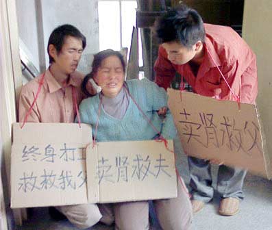 陕西省商洛市山阳县长沟镇45岁的村民韩文远在外打工时不幸被大火烧伤全身,生命垂危。为筹巨额医药费挽救他的生命,他的家人在四处求借无果的情况下,韩文远的妻子和两个儿子身挂“卖肾救夫”“卖肾救父”的牌子,在医院门前向市民跪地求救。
