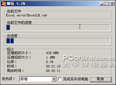 用了五小时五十四分,当最后的一个文件被解压缩出来后,笔者的脑中响起了凯旋的号角,并马上去查看解压缩后的Office 2007文件,发现其大小已经变成446MB,证明解压缩成功了!