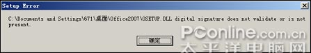 但这并不代表真正的成功,象一个几乎全程观看的朋友所说,只有解压缩后能用才是王道,笔者觉得很有道理,所以立刻双击Office 2007的Setup(安装)文件,却发现弹出了下图的提示: