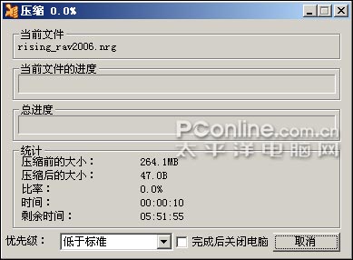 虽然Office 2007的实验证明了那个是虚假文件,但KGB压缩率是不是比WinRAR高这个倒还需要测试一下,于是笔者用了一个瑞星杀毒软件的nrg格式虚拟镜像文件(264MB)来进行压缩测试。