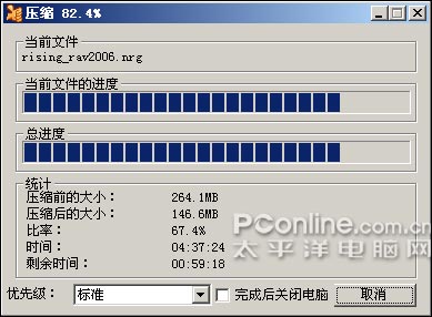而在这方面WinRAR的表现又如何呢?笔者立刻打开WinrRAR将同一个瑞星杀毒虚拟光盘源文件进行压缩,压缩方式调至"最好",得到的结果如下: