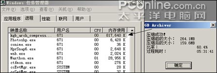 经过了五个多小时的艰苦奋战,胜利的曙光展现在眼前,虽然压缩后的文件还在增大,但有放缓的迹象,在156MB上浮动着,比率达到源文件的61%。而在过了五小时三十分后,文件终于压缩成功(看下图),我们看到源文件的263MB已经压缩到159MB,压缩率达到60%。虽然压缩率很高但笔者一点也高兴不起来,因为用了如此多的时间却只节省了104MB的硬盘空间,可以说是投入和产出严重不平等的典型。