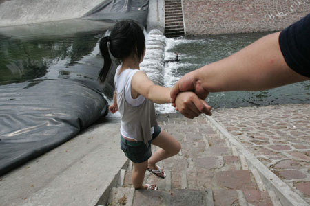 周林生前方河底处,是一个橡胶坝,橡胶坝宽1米多,用于存储和排放河水。虽然有管理人员不断过来吆喝:“别在这里玩水啊!”可还是有许多孩子脱光了鞋子跳到橡胶坝上,看着河水缓缓流过自己的小脚丫。