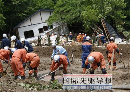6月15日,日本消防队员、陆上自卫队士兵在一处倒塌的房屋处寻找地震中的失踪者。路透社