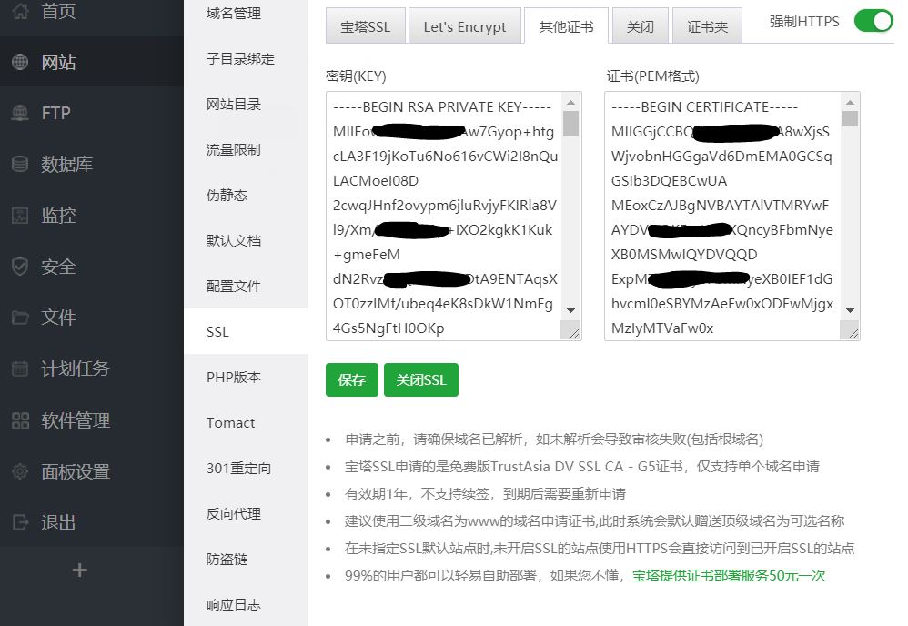 如果未提示错误,就申请成功了。根据提示,找到证书所在目录,大概应该是:/www/server/panel/vhost/cert/域名目录下,用Notepad++打开fullchain.cer(证书文件)与zhanzhangb.com.key(密钥文件)两个文件,将文件内容复制粘贴到宝塔面板——网站——设置——SSL——其它证书,如下图: