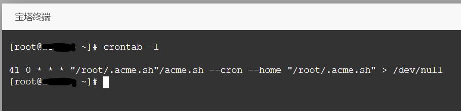 到此完成了所有操作,实现了Let’s Encrypt泛域名证书和自动续期。检查是否自动续期成功,可以在宝塔面板SSH终端中执行crontab -l命令查看,如下图: