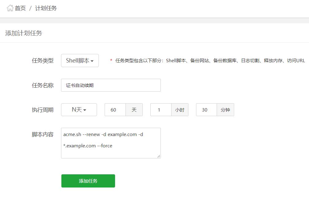 如果出现以上内容说明自动续期已设置,如果没有任何内容,也可以手动添加。宝塔面板——计划任务——Shell脚本:acme.sh --renew -d example.com -d *.example.com --force,如下图: