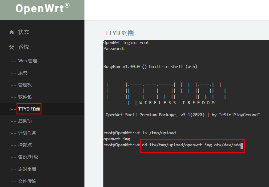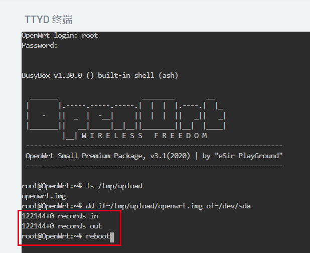 dd if=/tmp/upload/openwrt.img of=/dev/sda