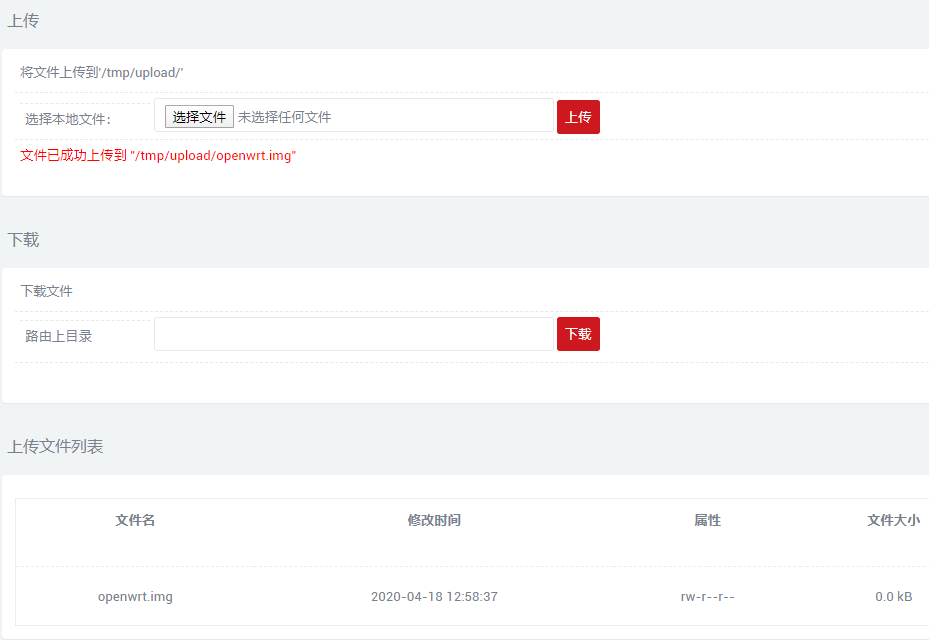 首先到系统 -> 文件传输这里,把本地的OpenWrt IMG文件上传上去。这里我把文件名改成了openwrt.img 这样后面命令行输入简单一些。下图就是上传成功了。