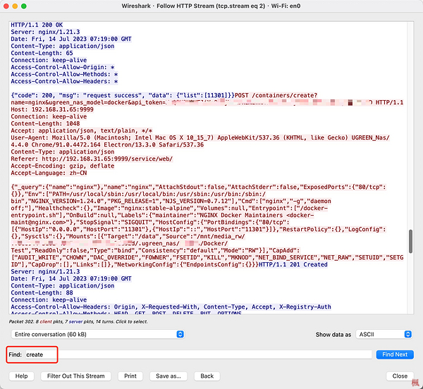 这时会看到具体的HTTP请求头和请求参数,在下方的Find里输入 create 进行查找,然后将红色内容复制到本地,将请求参数 {"_query"...} 复制到一个 json 文件