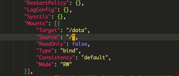 接着修改 json 文件,找到HostConfig -> Mounts,将里面的 Source 参数修改为 /