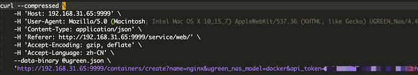 然后使用命令行手动请求创建容器,其中 ugreen.json 为抓包获取并修改后的参数文件,请求头保持一致