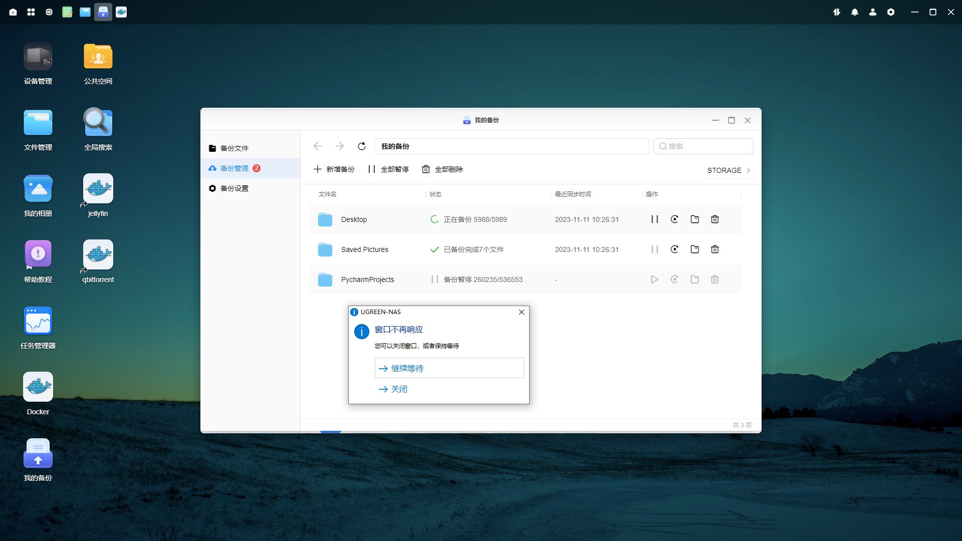 PycharmProjects 文件夹总大小 101GB ,文件数量 536957 ,文件夹数量 66488 ,这套套件的 PC 端备份在遇到十万以上数量级时会出现严重的性能问题,以至于现在我 4 天没有关机,第一次全量备份的完成度还未达到一半。而且备份文件的速度会越来越慢,在连续运行十来个小时之后会停滞不前,“我的备份”窗口会直接无响应挂掉,必须退出绿联私有云客户端再重新启动,它才会以一个比较慢的速度继续运行备份。而且是每十几个小时需要重新启动一次,天知道我离第一次备份成功还有多远。