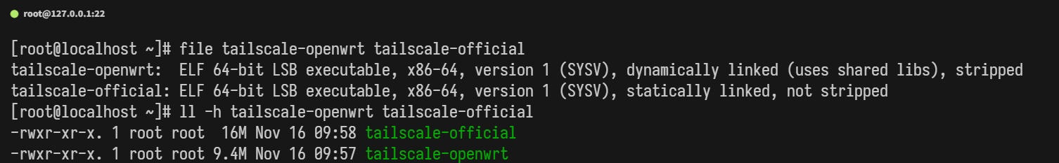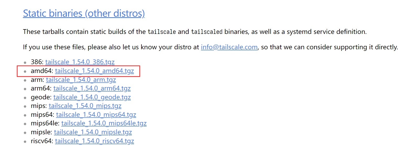 好在,Tailscale 官方的 packages release 为普通 Linux 编译好了一份静态链接库的版本,接下来我们要做的是去 https://pkgs.tailscale.com/stable/#static 下载 amd64 平台的 Static binaries ,并且替换掉 OPKG 释放到系统里的 binaries 。