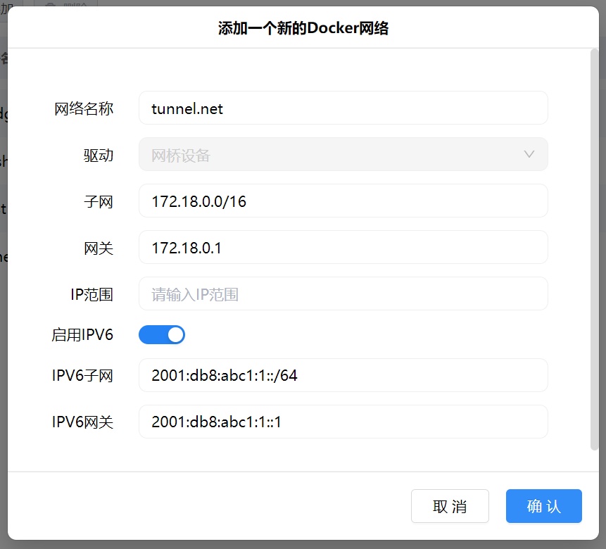 /* 加上这几行配置 */ "ipv6": true, "fixed-cidr-v6": "2001:db8:abc1::/64", // 并不需要严格遵守这里的 cidr ,任意一个内网 IPV6 网段皆可 "experimental": true, "ip6tables": true}保存后在绿联私有云 APP 的 docker 管理页中重启,这时候你就能够看到 bridge 网络已经具备 IPV6 地址。