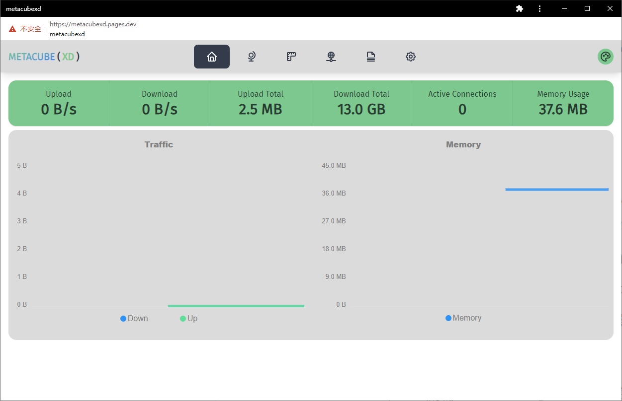 现在,通过 metacubexd PWA 即可访问内核。虽然顶部会有一个比较丑的“不安全”Banner ,但无伤大雅,能用。