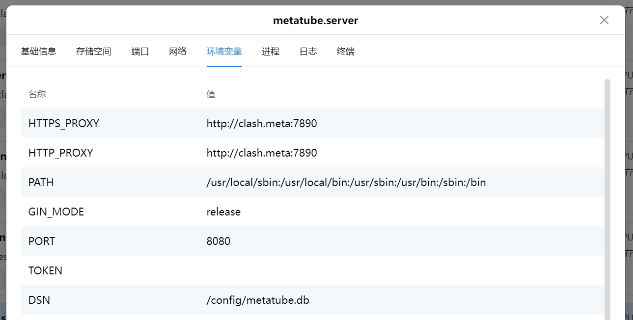 现在以一个 Jellyfin/Emby 使用的面向特定领域的资源刮削插件服务后端 metatube 为例,这个镜像已经支持在环境变量中指定HTTP_PROXY和HTTPS_PROXY,所以我们直接将这个容器创建到 tunnel.net 中,同时指定相关的环境变量: