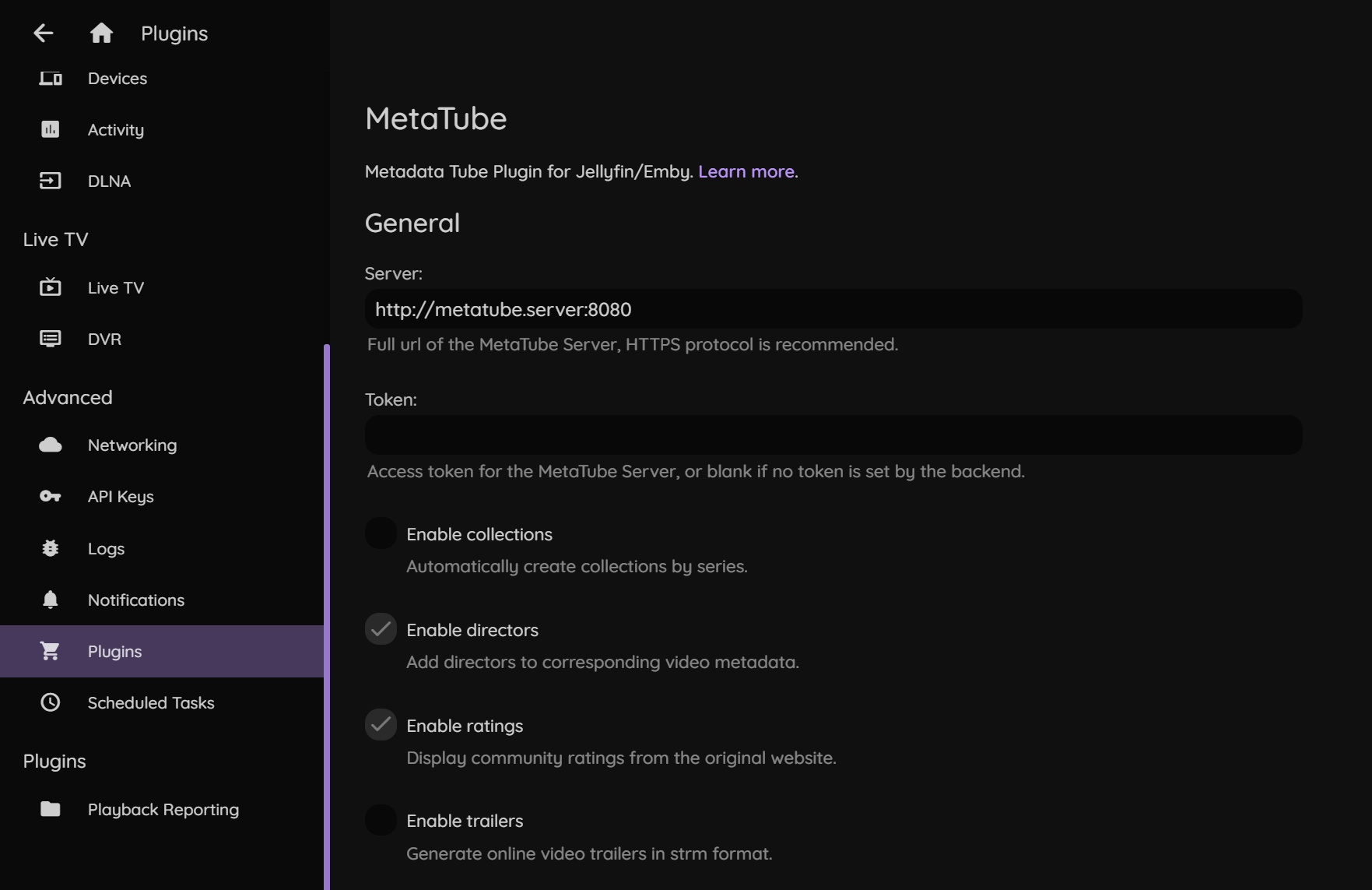 与此同时,在 Jellyfin Plugin 设置里,指定后端地址为 container name ,端口是容器内部定义的 PORT,而不是在容器启动时指定的对外的映射端口: