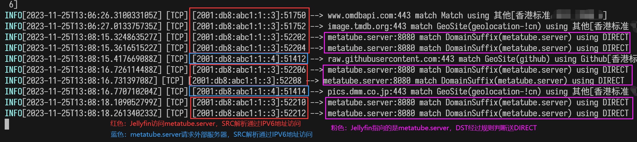 rules: # 将你的容器名和 docker network 网段全部指定为 DIRECT ,放在配置最前面 - DOMAIN-SUFFIX,jellyfin.server,DIRECT - DOMAIN-SUFFIX,metatube.server,DIRECT - DOMAIN-SUFFIX,*.downloader,DIRECT - IP-CIDR,172.19.0.0/16,DIRECT,no-resolve - IP-CIDR6,2001:db8:abc1:1::/64,DIRECT,no-resolve - ......