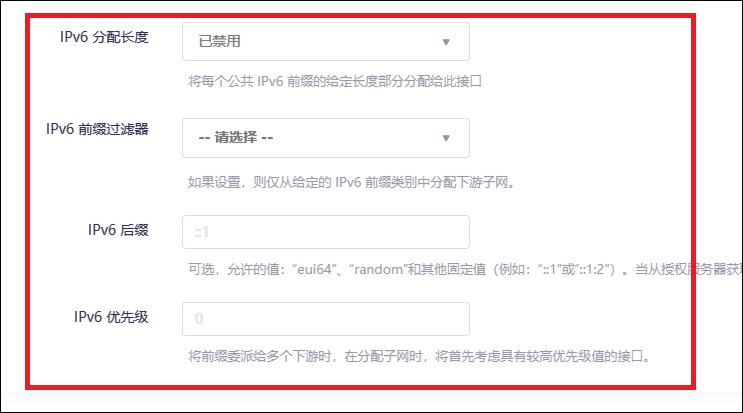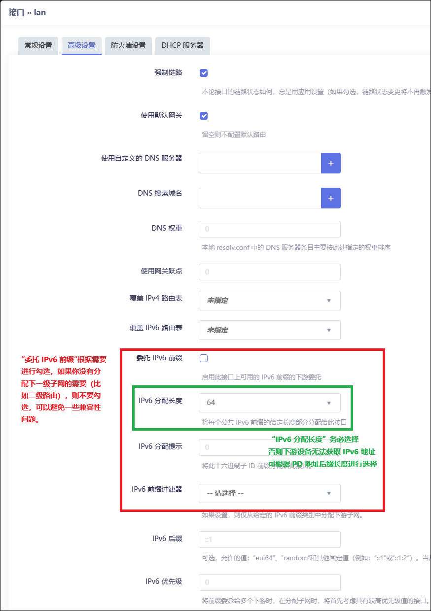 “委托 IPv6 前缀”允许下级设备再划分子网,按需勾选。