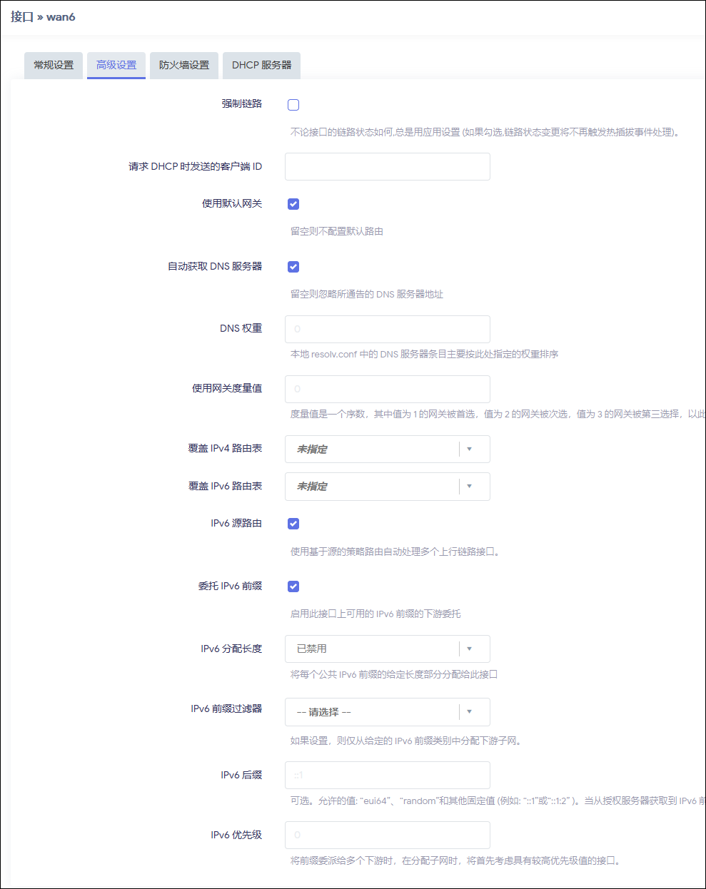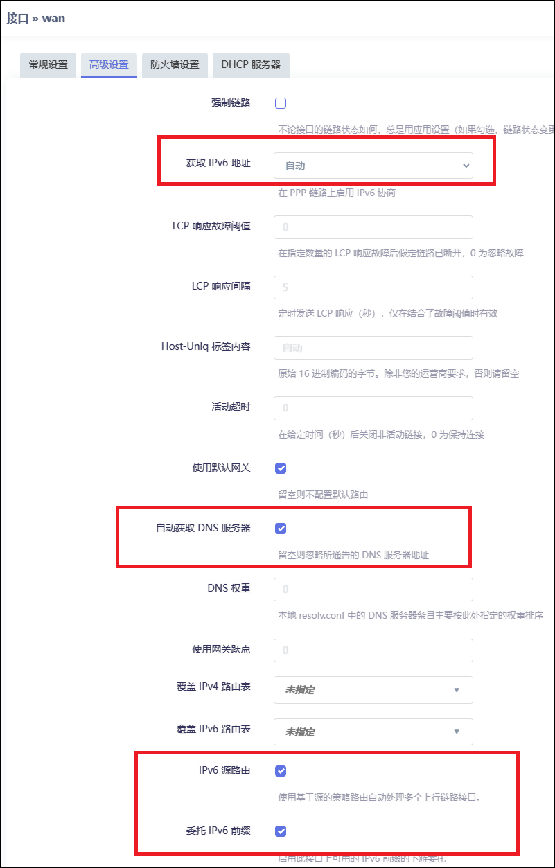 WAN > 高级设置 > 获取 IPv6 地址 WAN > 高级设置 > IPv6 源路由 WAN > 高级设置 > 委托 IPv6 前缀 WAN > 高级设置 > IPv6 分配长度