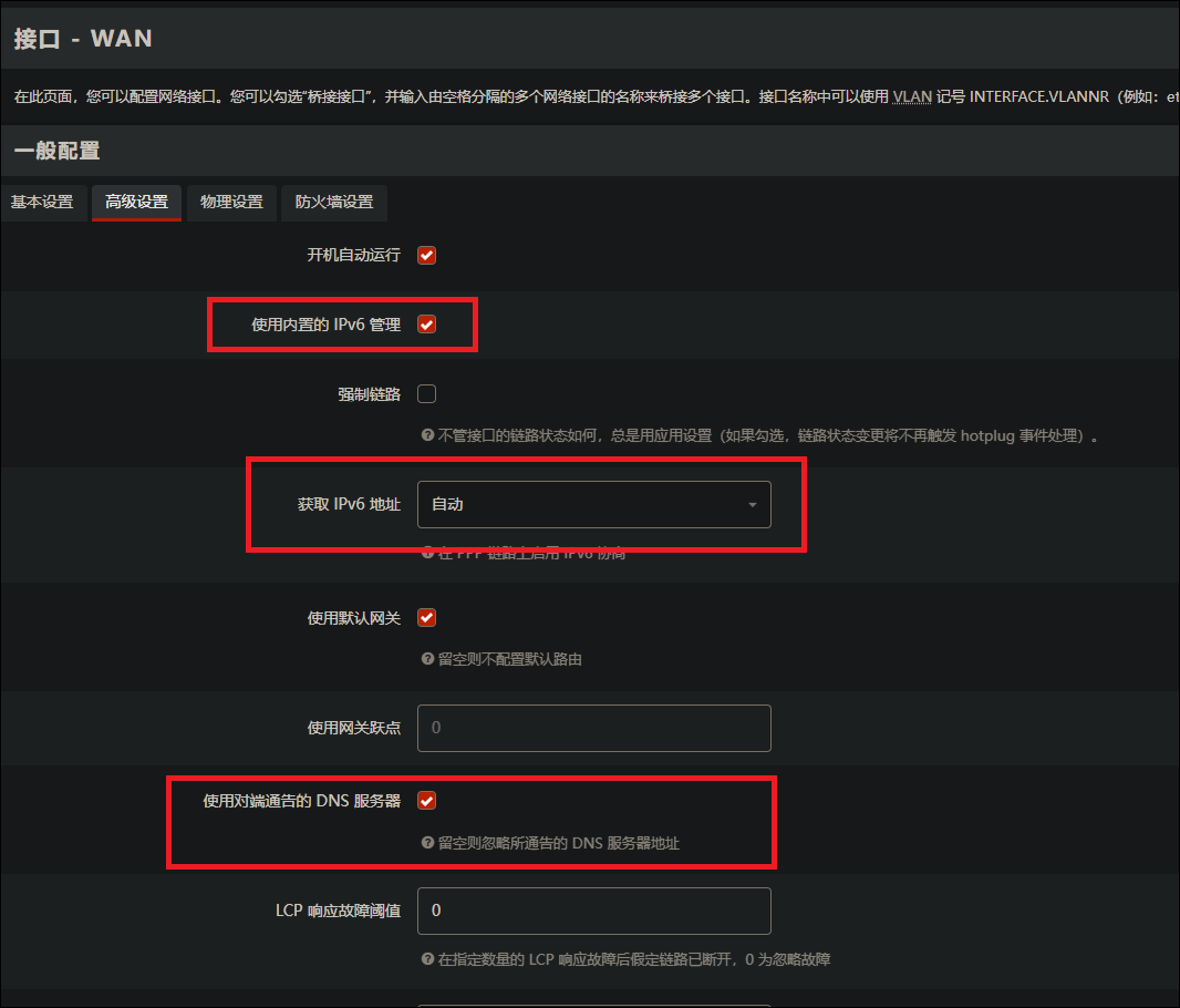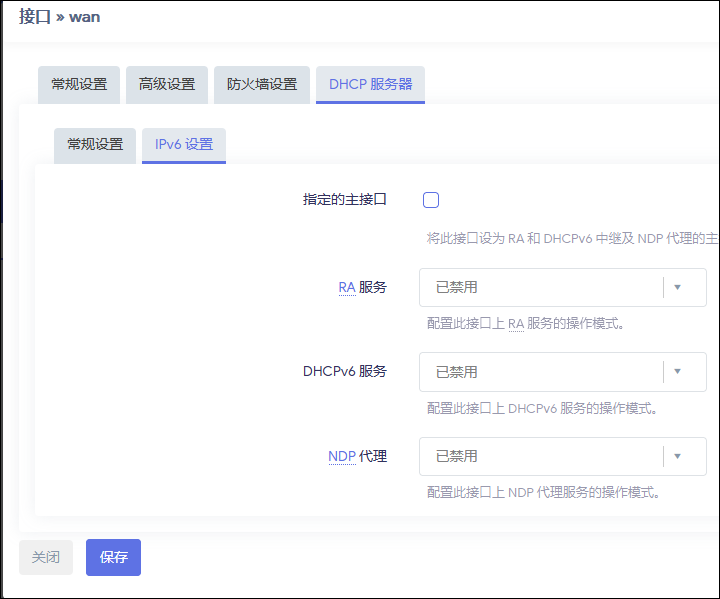 WAN 接口的DHCP中检查设置,确保DHCP > IPv6 设置已经关闭