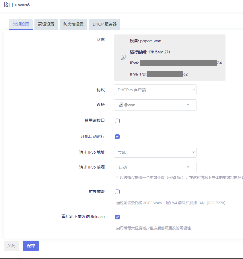 保存并应用配置后,检查 WAN6 接口是否取得了 IPv6-PD 地址。