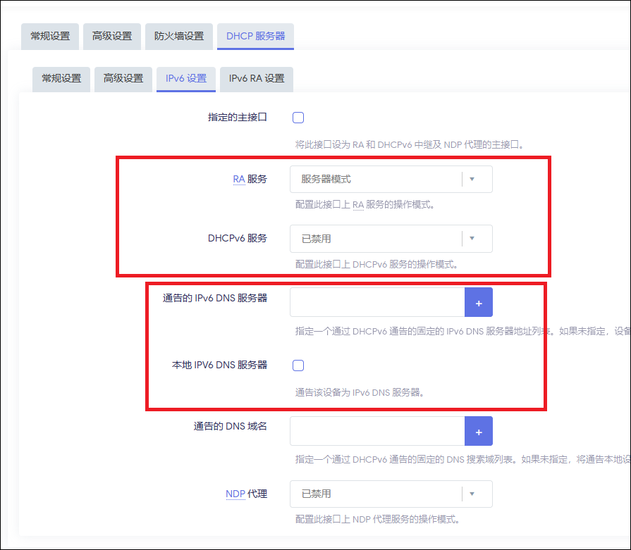 如此设置之后,局域网支持 IPv6 的设备都将获得一个固定且唯一的 IPv6 地址,并且 IPv6 DNS 为空。